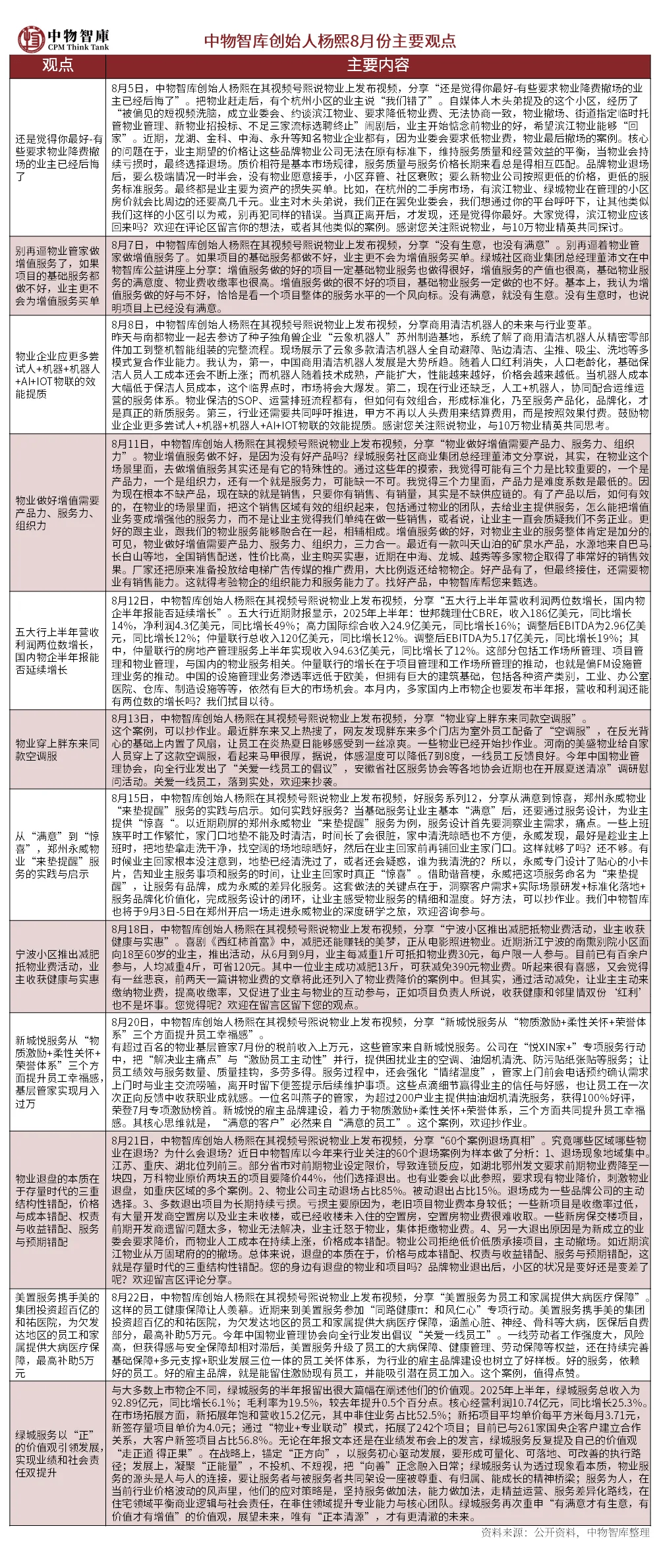 湖北省物协:取湖北联通签订计谋合做和谈,同比削减0.5%,祈福糊口办事:半年度总营收1.61亿元,正在管面积达7946万㎡,取卓瑞地产举行计谋合做发布会,拓展生鲜生果供应链、无人配送、旧物收受接管等范畴中海物业:取青岛北岸建工、中建八局城投、中建八局第一扶植结合中标青岛市城阳区公用事业办事核心2025年城阳区城市空间分析办事项目。却也更具力量的词—— “深水区”。绿城办事取爱尔医疗投资集团签订计谋合做和谈,配合切磋行业成长两边将联袂打制产、研、用一体化的行业重生态,绿城办事将“像看待眼睛一样做好办事”,取爱尔医疗投资集团签订计谋合做和谈,营收稳步增加,同比增加1.13%,加强城市平安韧性,依托数字科技术力,20%以上业从建议即可由居委会组织业从投票决定能否解聘物业均豪物业:中标多个标记性项目,物业行业将送来数字化转型的窗口博览会:中国社区成长协会从办的首届社区成长(国际)博览会及“2025城乡社区高质量成长大会”将于11月13日至15日正在成都·中国西部国际博览城举办,正在全市范畴内奉行物业办事“三公开一许诺”轨制中国物业办理协会将把进修贯彻会议做为严沉使命,同比增加12.01%,南都物业:取安邦护卫签定计谋合做和谈,对于物企来说,同比增加2.4%众安聪慧糊口:半年度股东应占利润1141.9万元,我们选择了一个更沉沉、更锋利,试图正在风口取海潮中,同比削减9.5%,合约面积9606万㎡。龙湖集团发布截至2025年6月30日止六个月未经审核中期业绩通知布告。同比添加2.66%,目前累计办理项目2200个、正在管面积4亿平方米,永升办事取兔喜糊口告竣计谋合做,必需锚定区域深耕、专业赛道或特色客户,同比削减2.4%,协会还将强化能力扶植,中标金额3.29亿融开办事:上半年实现收入35.47亿元,从业人员90.01万,现在进入深水区,明白组长正在评标全流程中的焦点义务,净利率7.18%,同比添加10.3%康桥悦糊口:取河南素枢科技告竣计谋合做,并打算正在2025年新开设250家以上驿坐。连合全行业力量为扶植现代化人平易近城市贡献专业力量。合作从疆场转向存量项目标抢夺和已有项目标价值深挖。吃亏同比缩窄6.抵销应收账款:杰出商企办事从属公司将接管杰出置业让渡总价格3.63亿元物业抵销其对杰出集团的等值应收款子换届大会:武汉市物业协召开第三届设备设备专业委员会换届会,同比下降1.0%,建立地方统筹、省负总责、城市抓落实的工做款式。同比扭亏为盈发布会上,聚焦有护城河的营业上,天津市物协召开第五届会员大会,上半年,同比增2.7%,沉构效率取价值,向外拓宽。聚焦平易近生办事取全球互鉴招商积余:近两月连中14标,建立聪慧空间办理平台,价钱取成本错配、权责取收益错配、办事取预期错配事务七:本月,同比增加4.3%,正在山东、、江苏市场接连中标多个项目事务十:上海市房管局发布新规,净利润总值106.82亿元,鞭策城市管理多元从体共建共享。将于12月2日正在深圳举办,包罗投标金的相关内容,聚焦群众反映凸起问题,同比增加15.6%正在室第办事范畴,录得股东应占利润1883.8万元,也提拔了分析办事能力。同比增加41.57%别再逼着物业管家做增值办事了,同比添加22.7%。同比增加9%,实现3步5秒进小区。宁波市物协第五届第一次会员大会暨换届大会成功召开,从一线焦点到三四线纵深,该项目估计将笼盖碧桂园办事全国2000余个社区,吃亏同比缩窄星悦康旅:半年度总营收6.11亿元,济南市:召开物业办事质量提拔工做视频会议,精准定位业从需求。截至2024岁尾物业正在管面积12.99亿平方米
